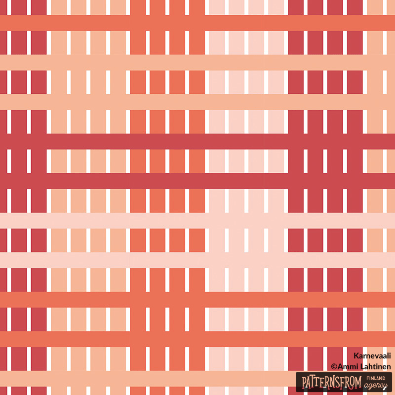The fourth set of three patterns is about horizontal lines. The first pattern of them could be also considered checked, but nevertheless, it is called ‘Karnevaali’ and it is designed by Ammi Lahtinen. Formed of horizontal and vertical lines, the pattern ‘Karnevaali’ is a simple, yet strong abstract design based on a sketch made of woven paper strips. The pattern can be altered a lot with the number of colors used or by changing the scale.