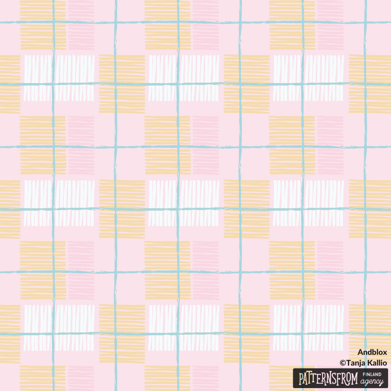 The last of all patterns is a pattern called ‘Andblox’ also designed by Tanja Kallio. This pattern is a geometric retro pattern inspired by a casual holiday on the beach. Hand-drawn and computer-edited ‘Andblox’ pattern has rhythm and depth in layers. ‘Andblox’ mirrors the patterns of the ’50s. Colors are pale like after a full summer of sunlight.