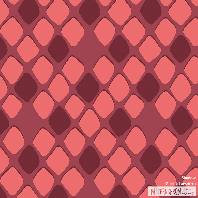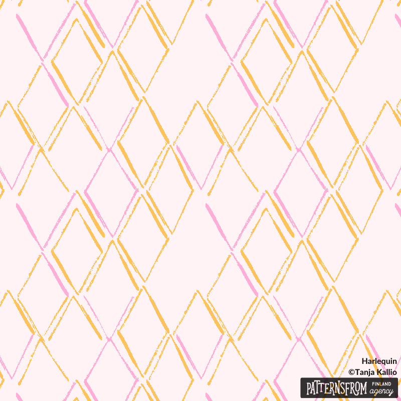 The second set of three patterns is patterns with diamond shape. The first of them is designed by Tanja Kallio. Tanja’s pattern ‘Harlequin’ is one of the patterns in the circus-themed ‘Veranda’ pattern family. It is a painted graphic pattern inspired by circus harlequins. The pattern works well as wallpaper but is suitable for multiple uses such as interior textiles and home accessories including curtains, towels, and pillows.