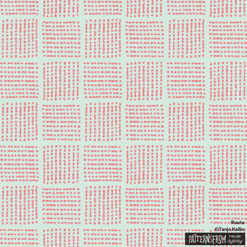 The third set of three patterns is about checks. The first pattern of them is the pattern ‘Ruutu’, a geometric pattern inspired by weaving textures. Photo-edited Ruutu pattern has a patchwork rhythm taken from Finnish weavings. It is designed by Tanja Kallio.