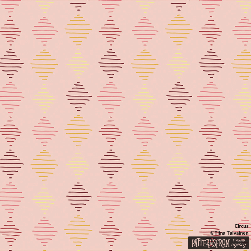 The pattern ‘Circus’ is designed by Tiina Taivainen. This pattern has geometric forms, but the pattern is still organic due to hand-drawn lines. Drawn irregular lines fascinate Tiina a lot: how they form lively surfaces and how they affect the colors used. The ‘Circus’ pattern is part of the ‘Carnival’ pattern family that invites you to a garden party with paper lanterns, lights, flags, and confetti.