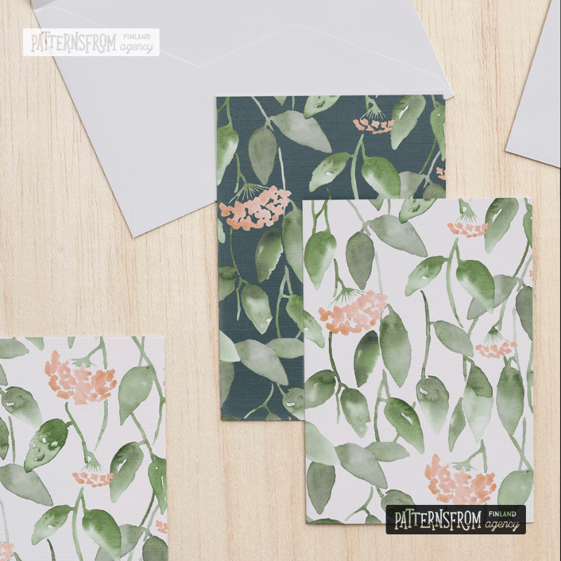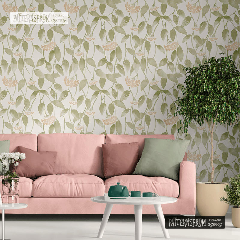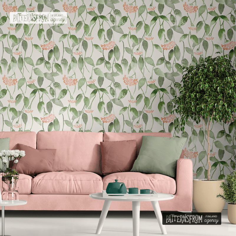 The “Carnosa” pattern is painted in watercolors to capture the lushness and delicacy of the climbing plant. Perfect for romantic interiors, the design can be produced both as a digital print and in screen printing.