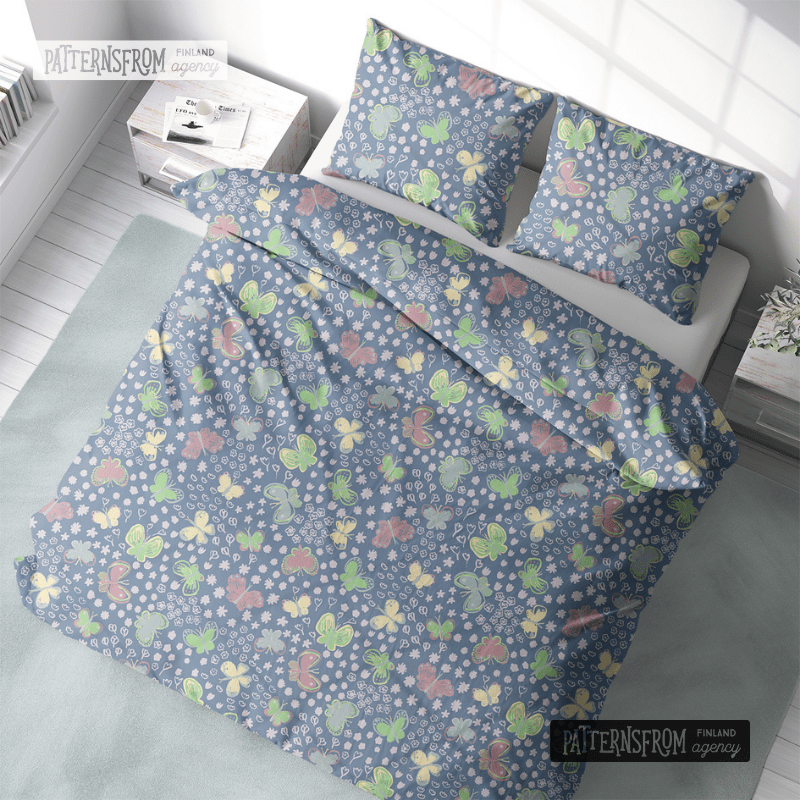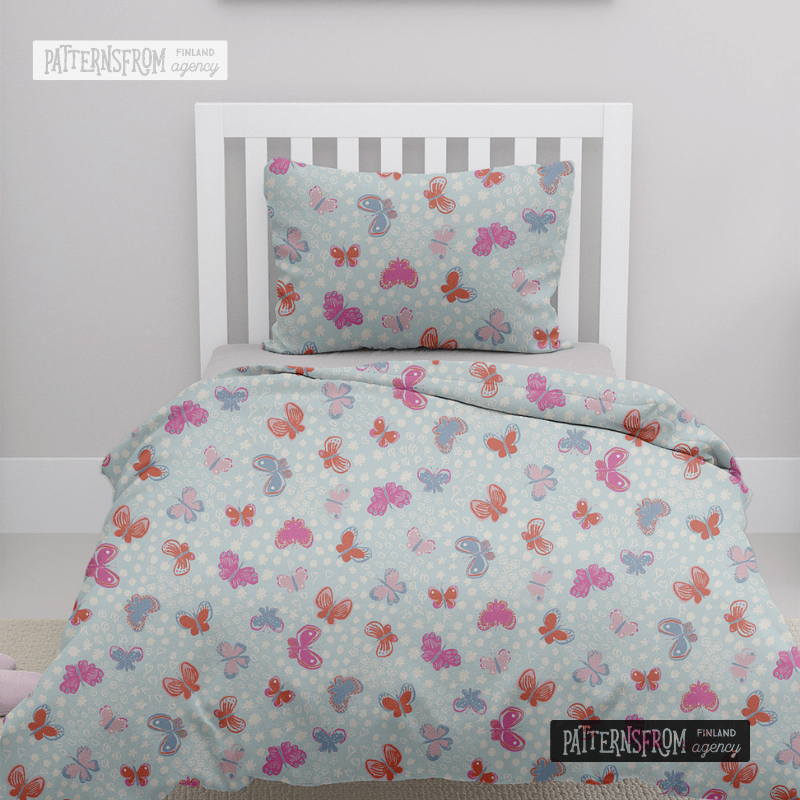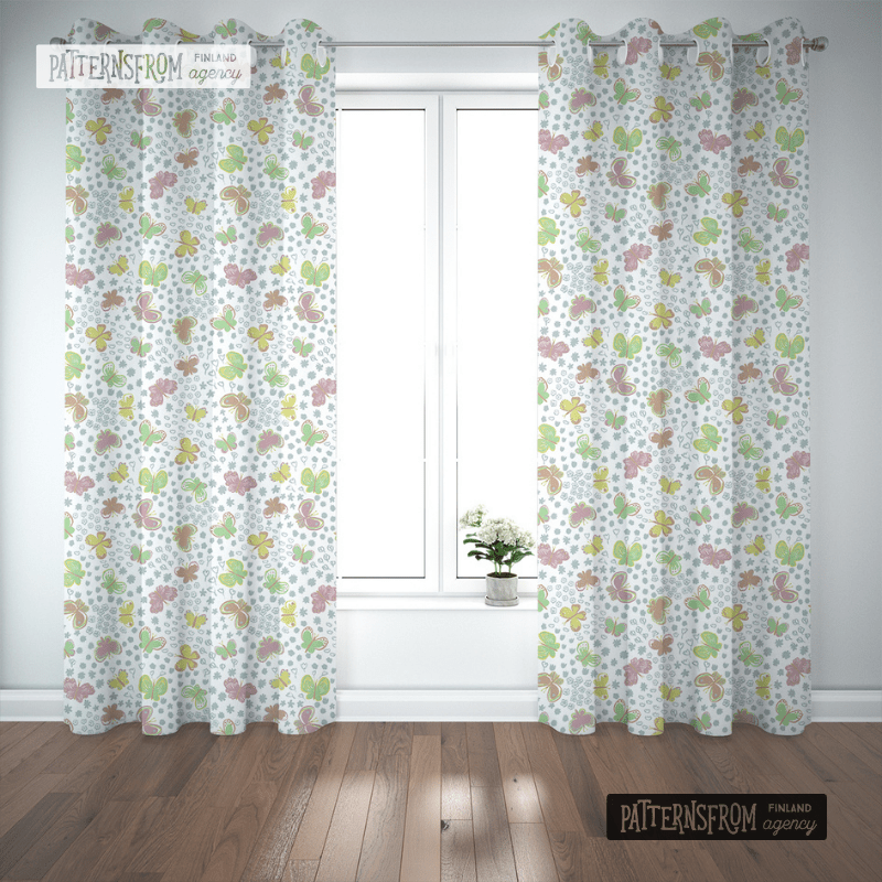 The ‘Niityllä’ (In the meadow) pattern family is designed especially for children. The patterns were originally made by hand drawing and painting. The delicate and romantic ‘Perhostanssi’ (Butterfly dance) pattern is not just for children, it’s also suitable for a variety of uses in interior design and clothing. The colorful “Perhostanssi” features butterflies flying in a meadow and it’s painted with watercolors.