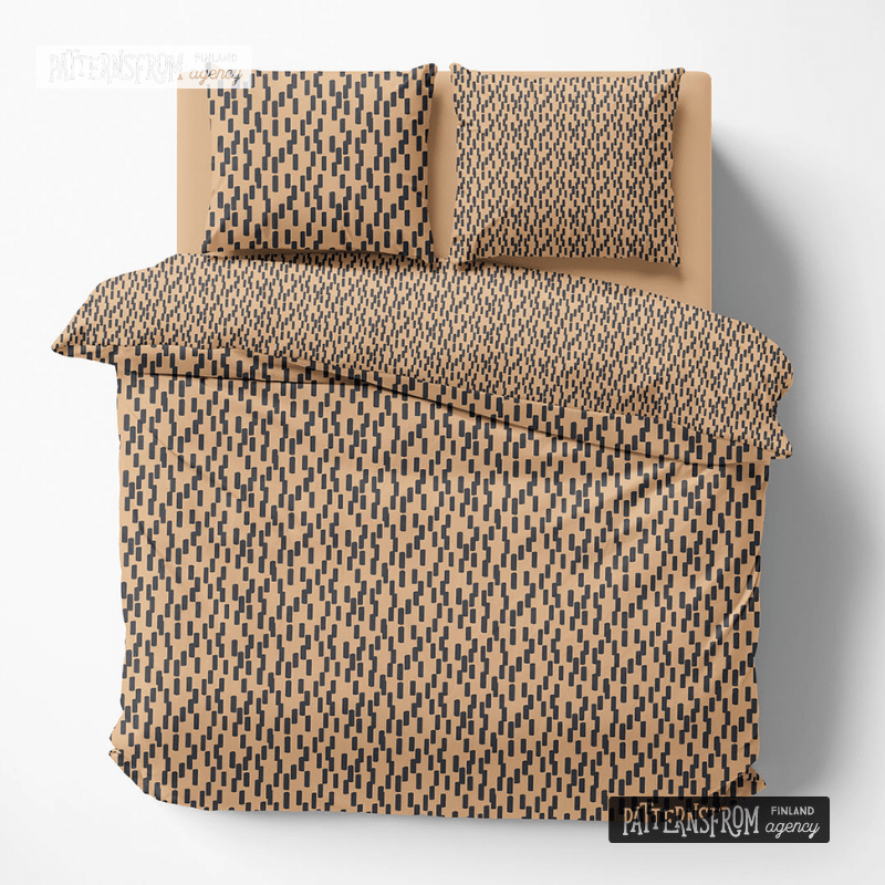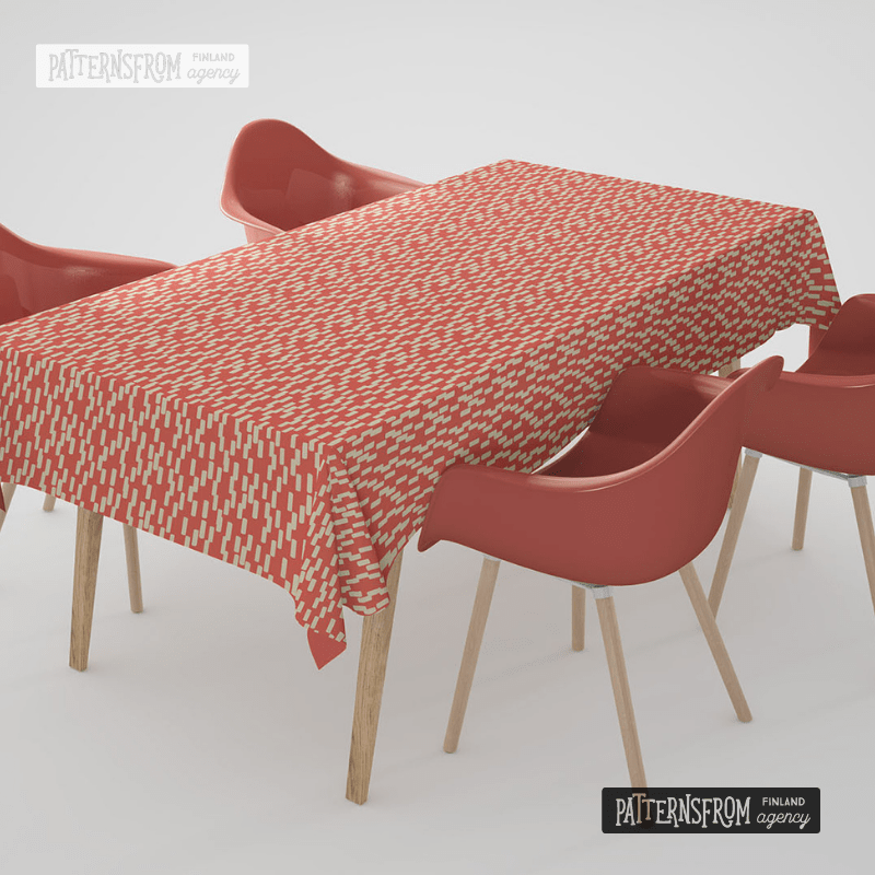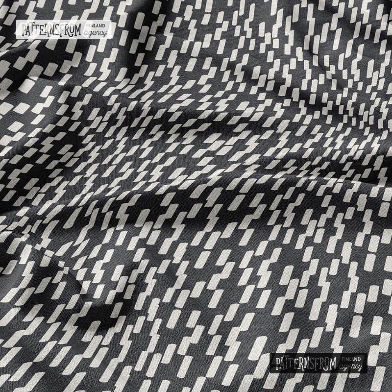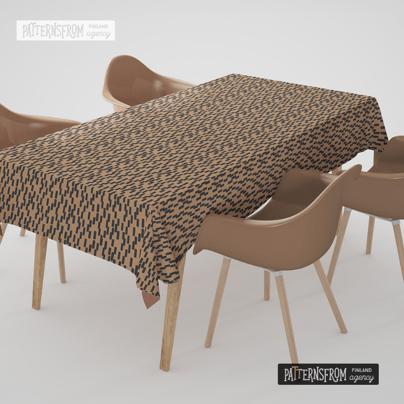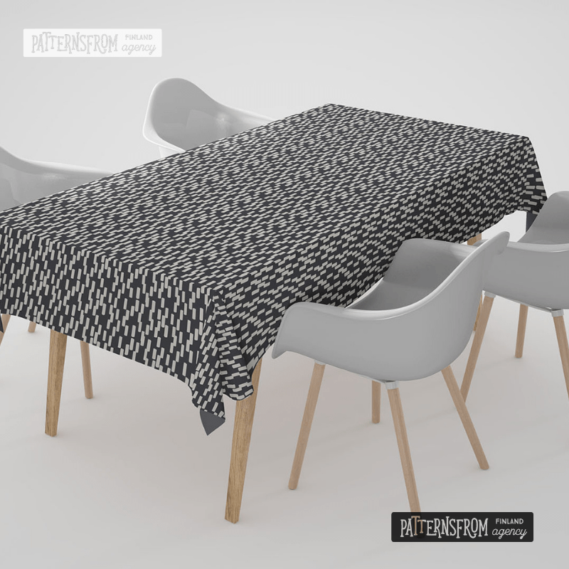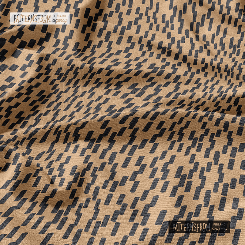The “Nomad Modern” pattern family has graphic, hand-drawn patterns for bold interiors. The “Tenho” pattern’s name means ‘fascination’ and is an abstract line pattern for bold interiors and textiles. It works in different scales and colour combinations, giving different moods alone or in combination with other patterns. This two-way hand-drawn and digitally edited pattern is especially suitable for interior textiles such as tablecloths and bedding. On a bit smaller scale, it is also a stylish alternative for modern fashion textiles.
